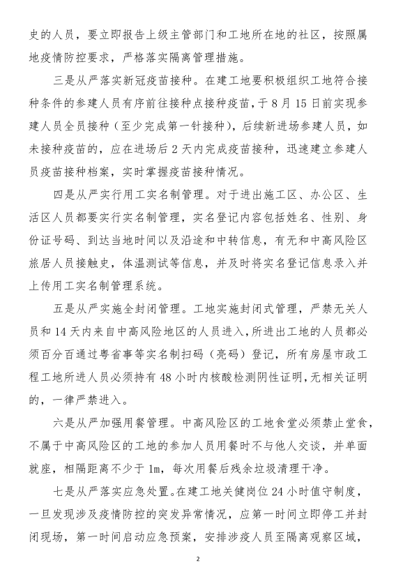 近期,國內多地突發(fā)本土疫情,江蘇宿遷、湖北武漢等地建筑工地已出現新冠肺炎確診病例,疫情在工地傳播的風險進一步加大。為深入貫徹落實習近平總書記關于疫情防控工作的重要指示精神,根據省委、省政府關于疫情防控的工作部署,按照全省疫情防控和安全生產電視電話會議要求,我廳決定在認真執(zhí)行2020年2月印發(fā)的《廣東省房屋市政工程工地防控新冠肺炎疫情工作指引》的基礎上,對部分常態(tài)化疫情防控措施進行提檔升級,提出了以下9方面要求。請結合本地區(qū)工作實際認真貫徹落實,毫不松懈地抓好房屋市政工程工地疫情防控各項工作。