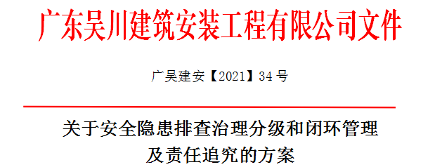 為建立安全隱患排查治理長(zhǎng)效機(jī)制,強(qiáng)化安全生產(chǎn)主體責(zé)任,加強(qiáng)安全隱患治理,防止和杜絕事故發(fā)生,保障施工項(xiàng)目的安全生產(chǎn),現(xiàn)結(jié)合公司的實(shí)際,特制定安全隱患排查治理分級(jí)和閉環(huán)管理及責(zé)任追究的方案。