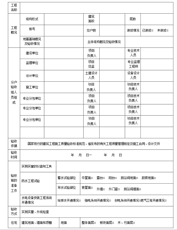 1、建設(shè)單位作為住宅工程質(zhì)量分戶驗(yàn)收的第一責(zé)任人,應(yīng)根據(jù)工程 的實(shí)際情況填寫《住宅工程質(zhì)量分戶驗(yàn)收方案》; |