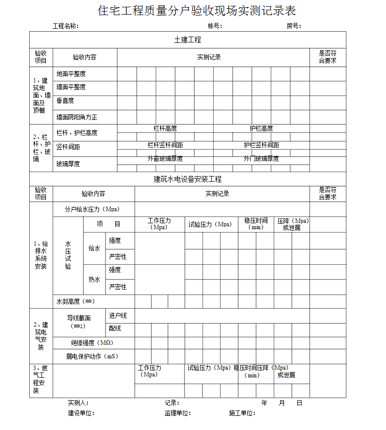 住宅工程質(zhì)量分戶驗收現(xiàn)場實(shí)測記錄表